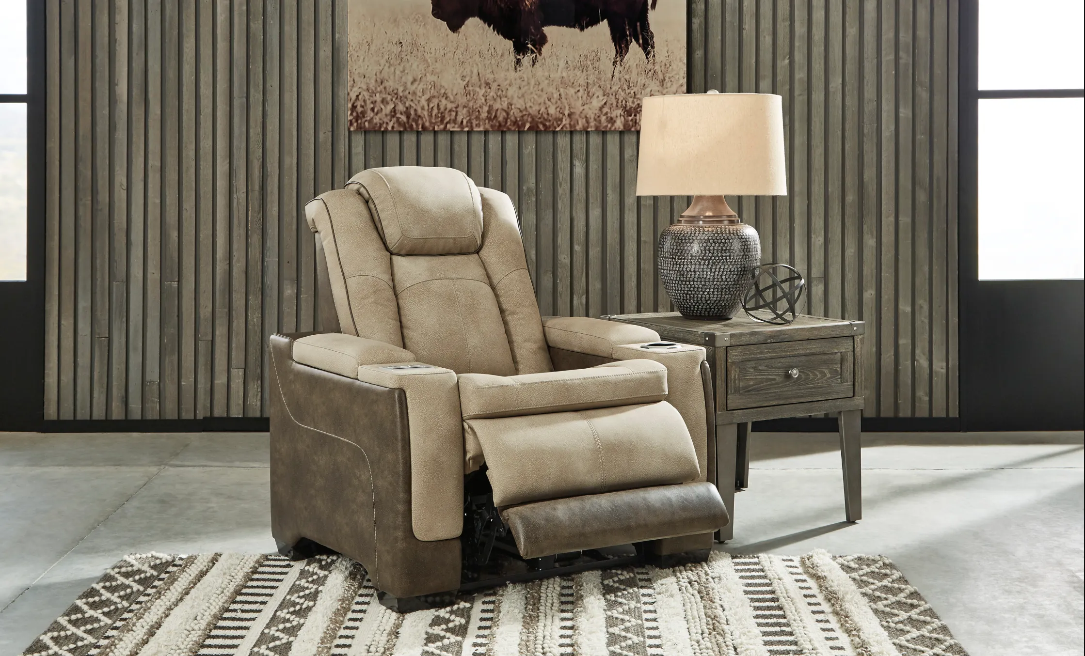 It captures the upscale look of leather in a more affordable, family-friendly faux leather that’s both durable and water-repellent. Designed with modern living in mind, it offers advanced features like wireless and USB charging, an adjustable headrest, and an extended ottoman—making it the ultimate next-generation recliner.