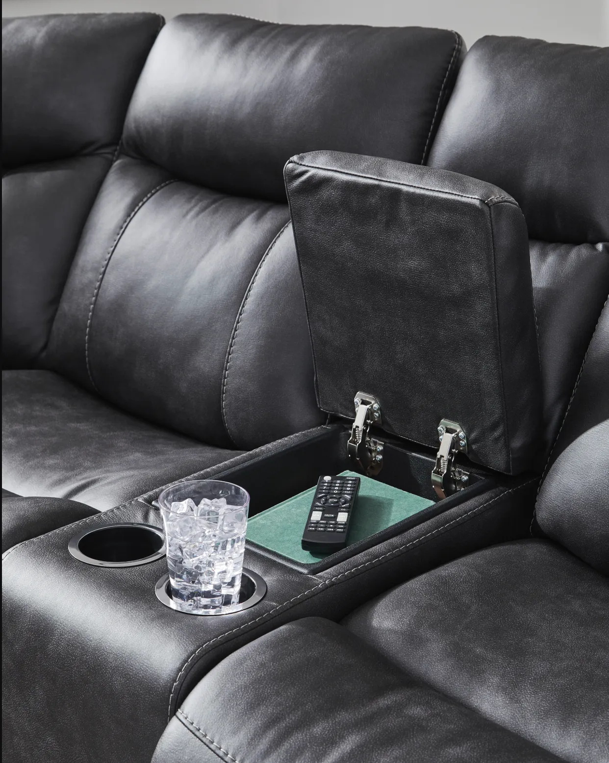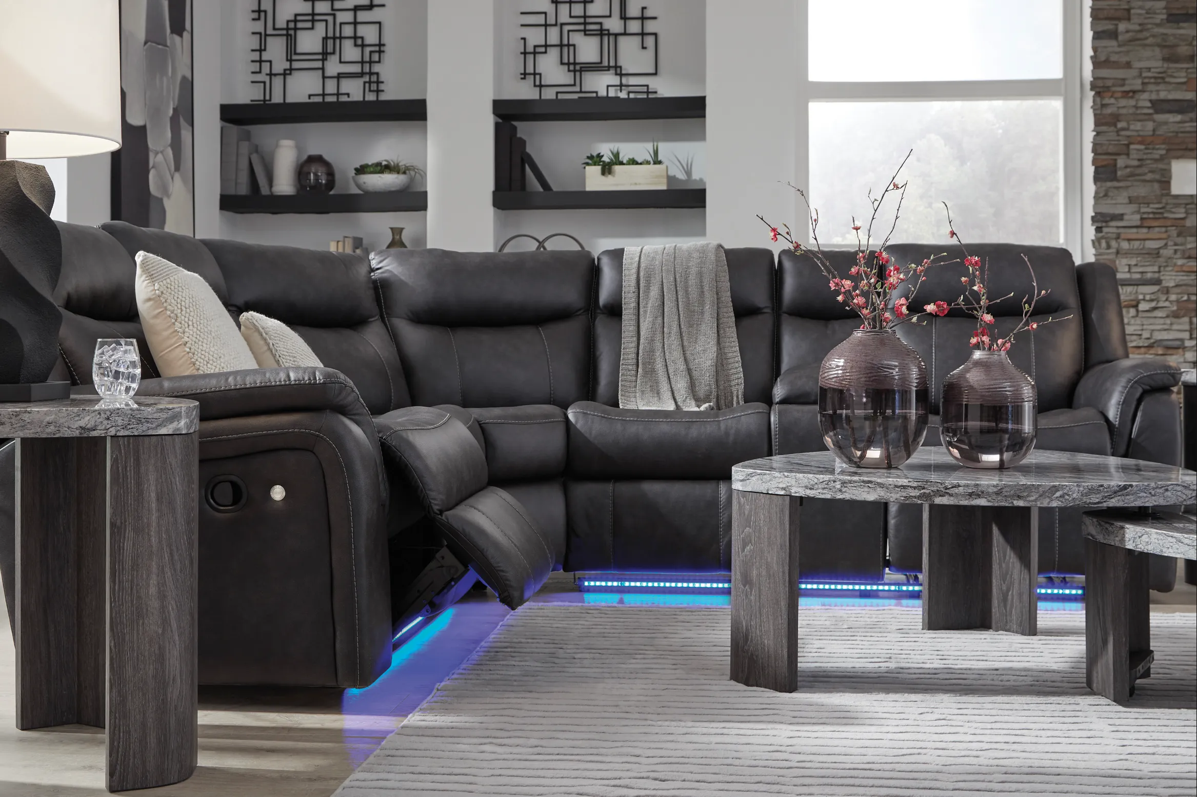 LED lights on the underside put a modern twist on the simply chic design—choose from three colors to add ambiance to movie night or gaming with friends. And you can keep remotes, drinks and other entertainment essentials close with the handy console. Ready to relax? Easy pull tab reclining has you stretched out in no time.